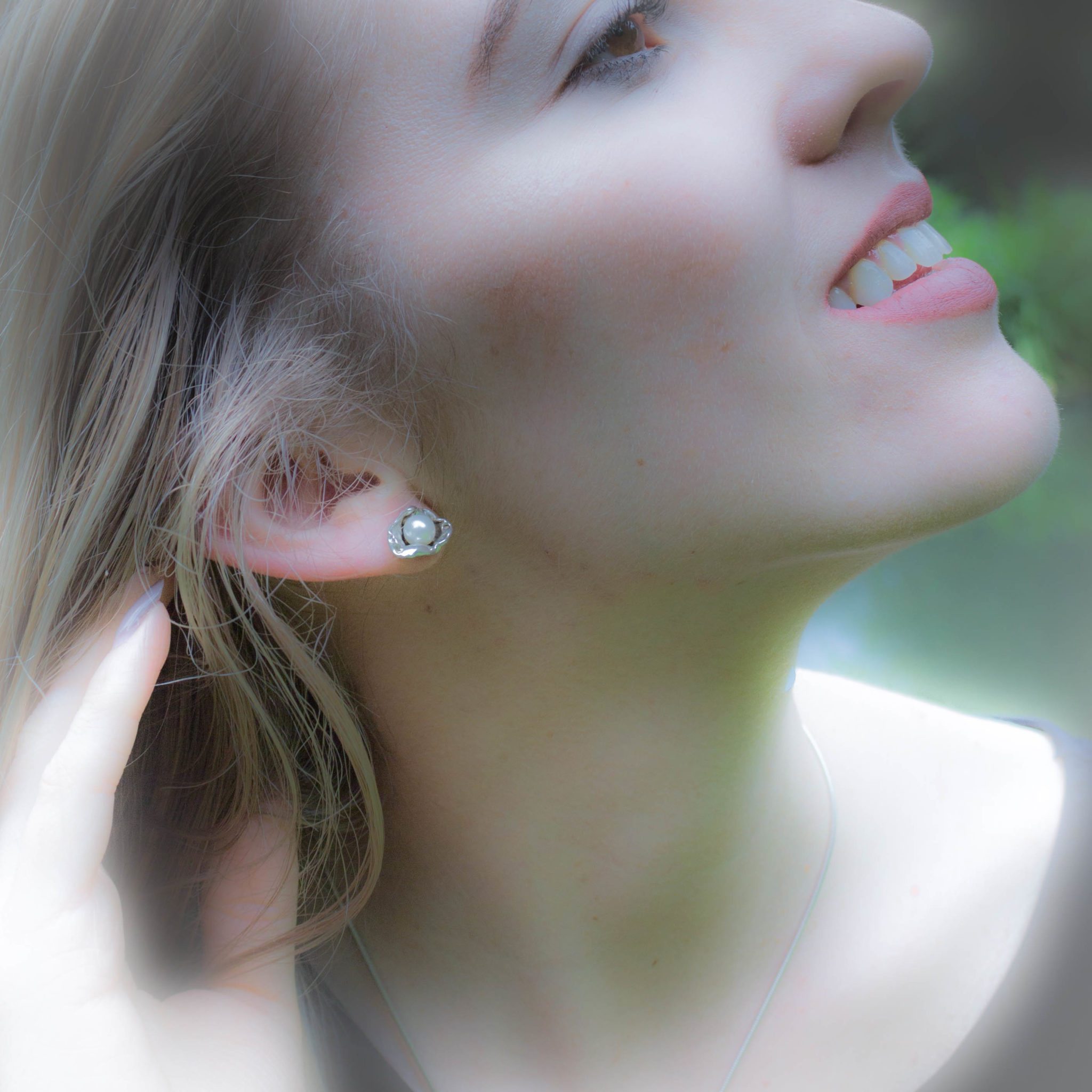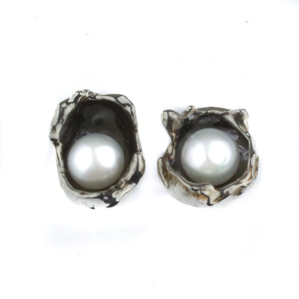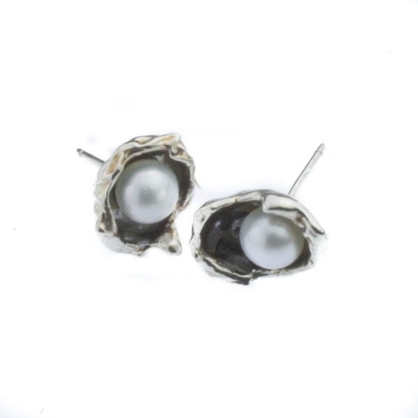 These very organic single shells hold a 5.5-6 mm grade-A fresh water pearl. Post earrings with sterling silver comfort clutch ear nut.