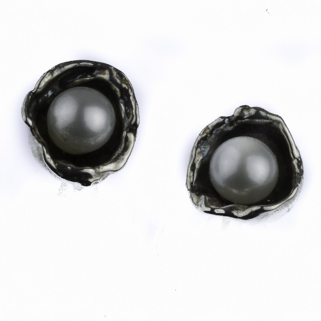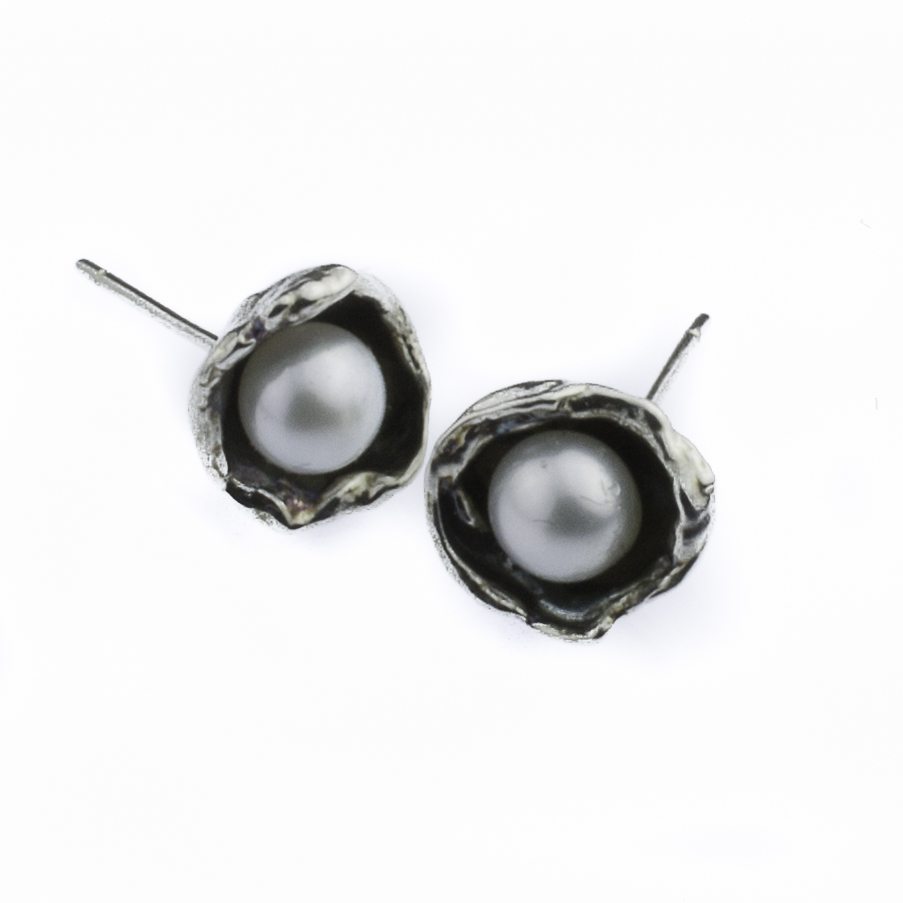 Refined, smooth single shells hold a 5.5-6 mm grade-A fresh water pearl. Post earrings with sterling silver comfort clutch ear nut. Each pair is an original casting so shapes may vary from pictures shown.