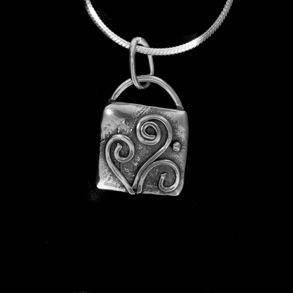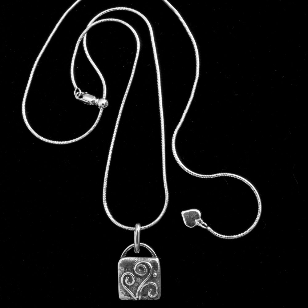 This silver Fiddlehead pendant is 0.5" x 0.5". Also included with the pendant is a 1.3 mm sterling silver snake chain adjustable up to 20".